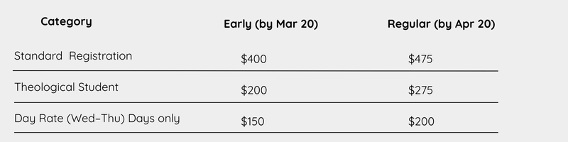 Discount: The discount for theological students applies to those undertaking a first degree in theology (Bachelor of Theology, Master of Divinity, etc.) who are actively preparing for ministry in a Canadian church but who are not yet ordained or recognized as ministry personnel. Students undertaking second or subsequent degrees in theology (S.T.M, D. Min., Ph.D., etc.) can register at the standard rate.